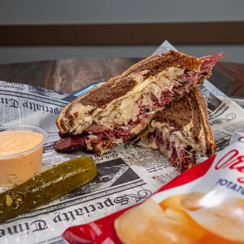 Toasted Rye, Swiss Cheese, Kraut, Corned Beef, Side 1000 Island, Chips, Pickle